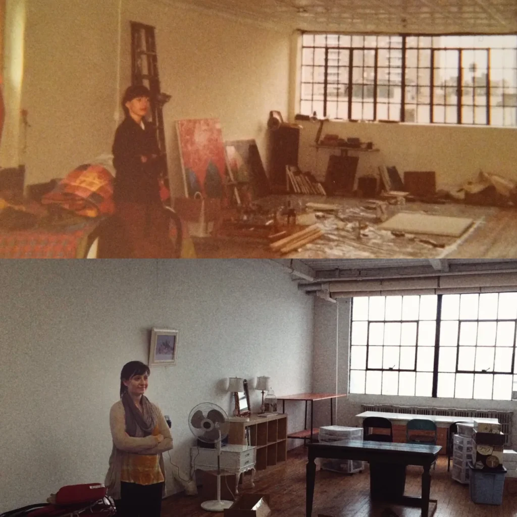 It’s been fantastic having my studio at home, especially with two little kids. I try to stay out of the studio during non-work hours, but it’s nice to be able to pop in whenever I need to. I’ve had a few different workspaces over the years and I’ve loved them all, but nothing beats having my studio at home! My favorite studio (other than my current one) was in the Shirt Factory in Kingston. It was a big open space with huge windows. Right after I moved in, my husband snapped a photo of me and it just so happened to look just like a photo of my mom in her art studio in NYC from the late 70s.