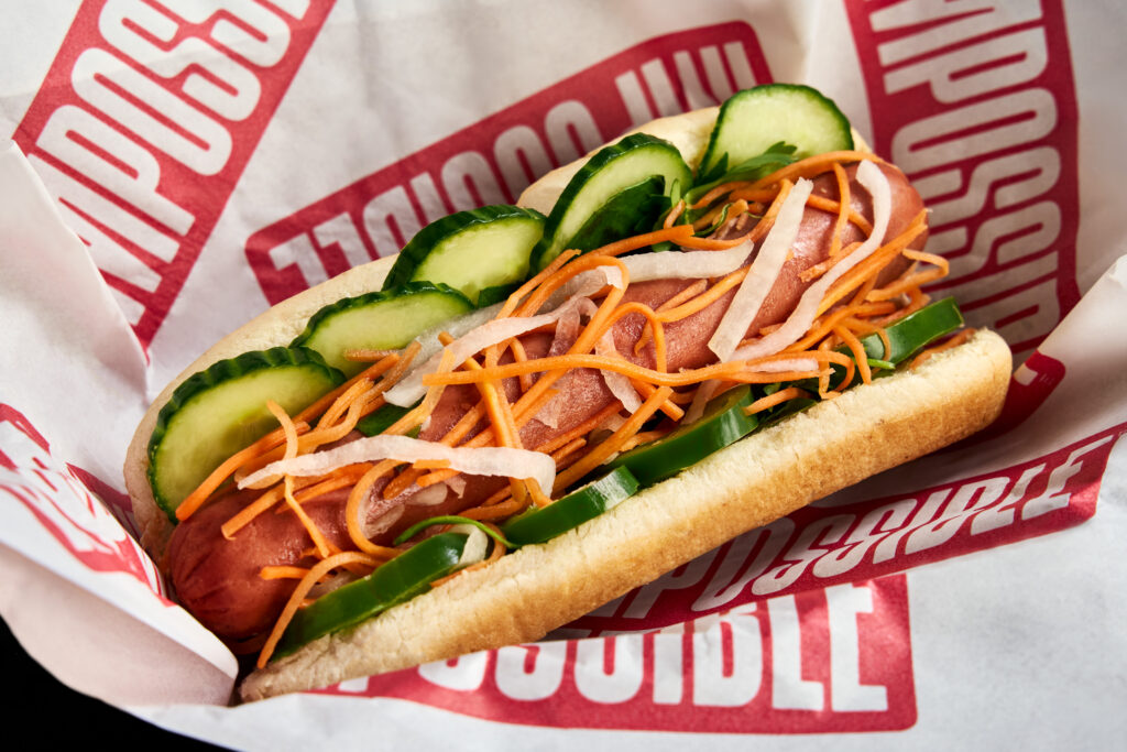 • Impossible® Banh Mi Hot Dog featuring a juicy Impossible® Beef Hot Dog, plant-based dijonnaise, pickled daikon, carrot, jalapeño, Persian cucumber, cilantro, Thai basil, and toasted sesame seeds.