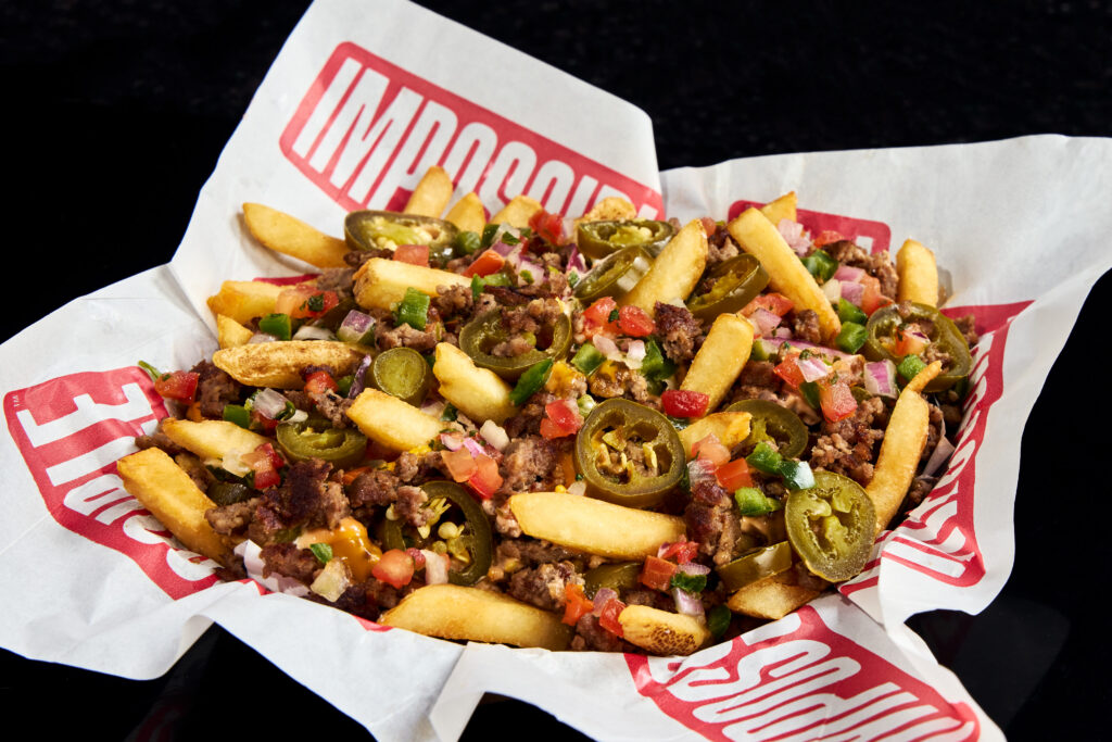 • Loaded Impossible® Chopped Cheese Fries with seasoned Impossible® Beef, onions, plant-based cheddar cheese, pico de gallo, pickled jalapeños, and Rafters Sauce.