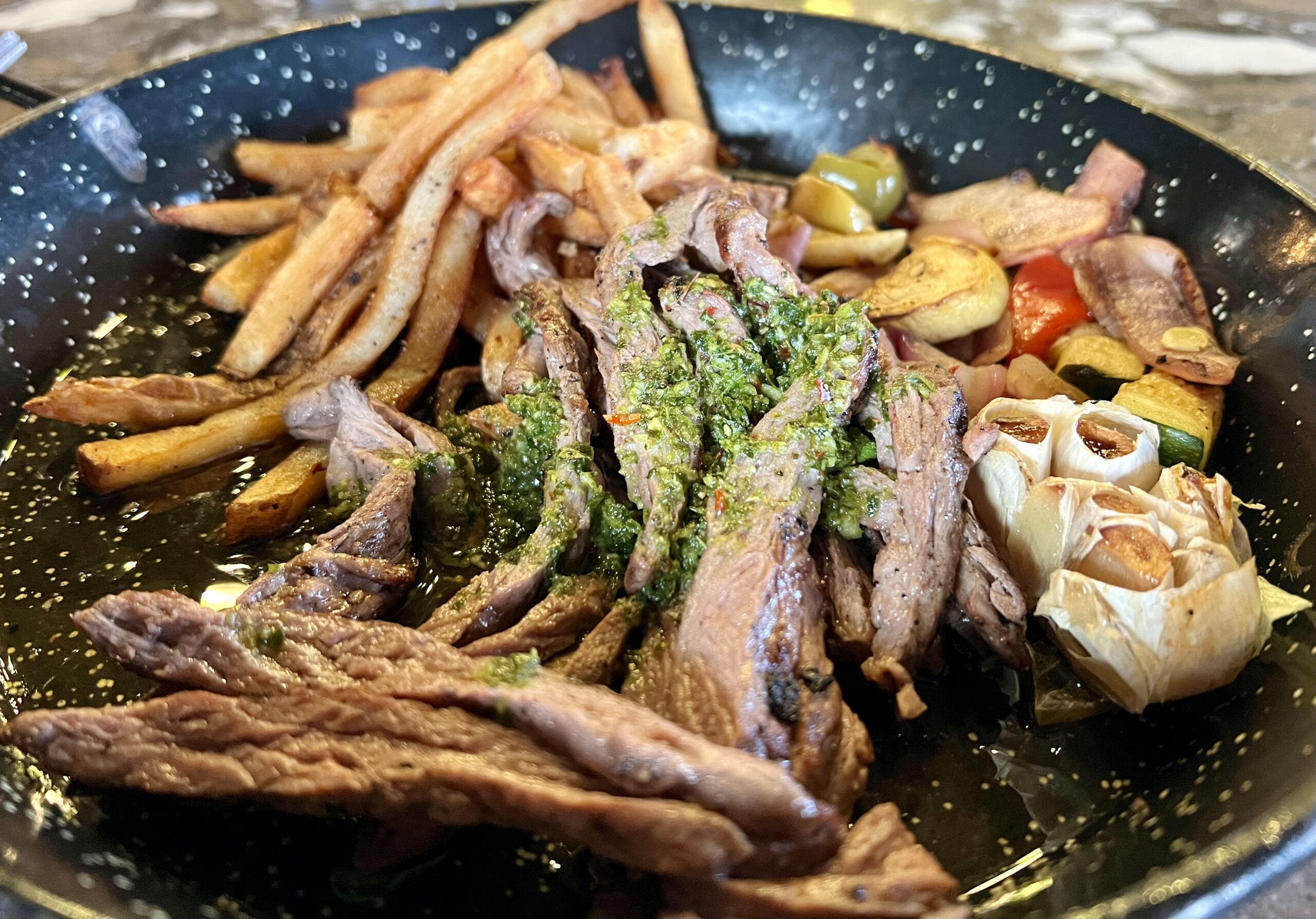 I didn’t expect a steak to flirt with me—but the parrillada-grilled skirt steak arrived sizzling and seductive, like it knew exactly what it was doing. Each slice was char-marked and brimming with juicy bravado. The texture? All snap and surrender, perfectly seared. Wood-fired vegetables played backup like a smoky jazz trio, their edges caramelized, still holding a whisper of crisp. The chimichurri? Spicy, garlicky, bright green mischief spooned right over the top, tying it all together like a firecracker on a silk ribbon. And the fries–classic hand-cut with the skins on—rustic, golden, perfectly salted, and built for dipping. This isn’t just a steak. It’s a full-throated declaration from the grill gods, and I was more than happy to listen.