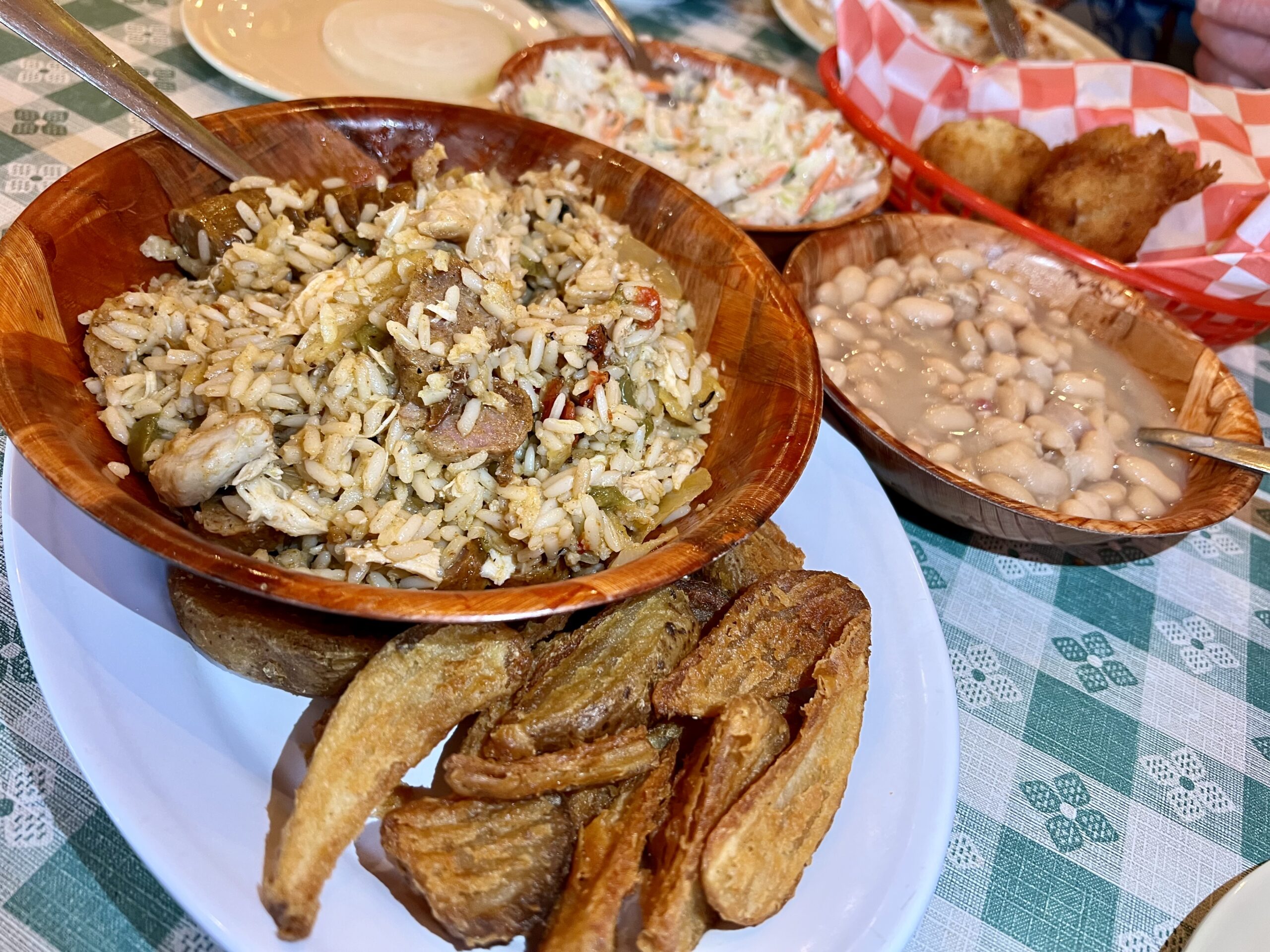 I don’t know who this Uncle Bud is, but I wish he was in our family. Anyone who serves up a plate like this deserves honorary kinship. The jambalaya hits like a warm Southern lullaby: creamy rice soaked in creole sauce with bites of tender chicken and savory sausage that seem to hum in harmony. Then come the sides, and mercy—white beans so creamy they melt mid-sentence, coleslaw slick but not sloppy, and seasoned steak fries crisp enough to earn respect, soft enough to keep it. A slice of Vidalia onion brings sweetness with a sly little bite, and the hush puppies? Crunchy shell with a fluffy cloud inside. If Nashville and New Orleans had a food baby, this is the glorious, bayou-born result.