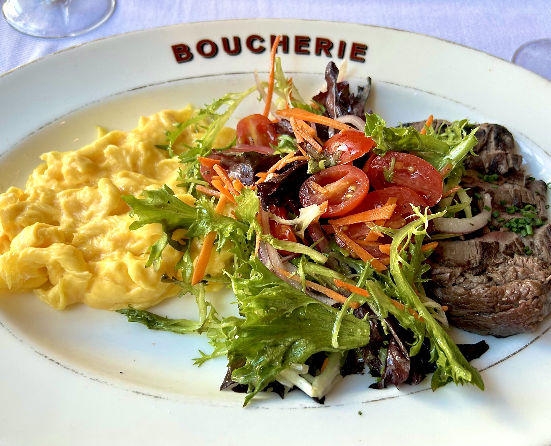 From the gilded Parisian architecture and jaw-dropping 34-foot high ceilings to the perfectly cooked steak and eggs, La Grande Boucherie has BLOWN ME AWAY! True to its name, French for “The Great Butchery”, this spot lives up to its reputation with an array of mouthwatering cuts of meat. My steak cut like french butter (the butter of all butters), tender as ever and bursting with flavor! Paired wonderfully with French scrambled eggs, slow-cooked and creamy, and a bright, citrusy, tangy salad that balanced the dish beautifully. Pair it with their popular cocktail, La Vie en Rose, and you won’t be disappointed. The glitz and glam, the steak and eggs–already looking forward to my next trip!