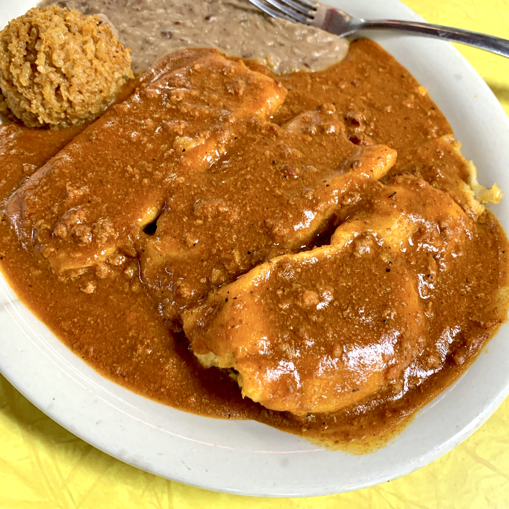 Talk about a pilgrimage! Stuck out there on I-40 in the middle of nowhere, just about a mile east of THAT corner in Winslow, Arizona, you’ll find where the locals go. Brown Mug Cafe lives in a low-slung building with a for real, non-retro neon sign on the road out of town. Stroll through the door and you feel like you’ve walked into the world’s best Mexican coffee shop. A handful of booths, a friendly counter, a legit pay phone in the back. I went simple with the tamales. They had a creamy gentle meat filling and the sauce was lip-smacking beyond flavorful. The refrieds knocked it out of the park and the rice ball was adhered with butter or oil? Sooo good. The sopapillas and honey that came with it were amazing! Come here. Take it easy. You won’t be sorry.